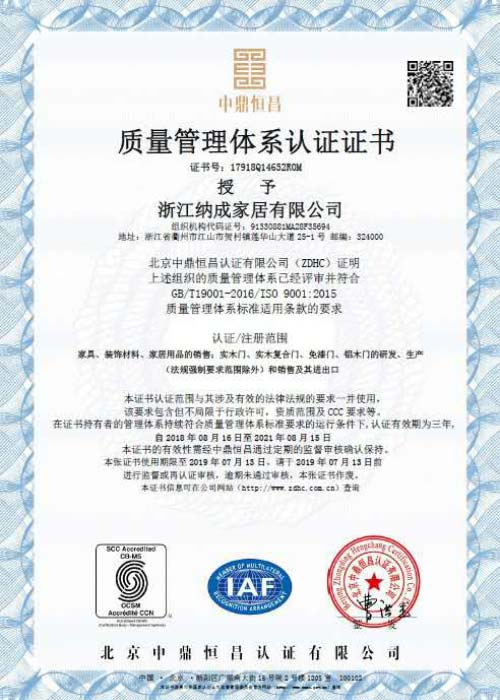 公司通过了ISO9001:2000质量管理体系认证和ISO14001:2004环境管理体系认证?;瘛罢憬×忠盗菲笠怠薄ⅰ罢憬∨┮盗菲笠怠?、“衢州市名牌”、“衢州科技性企业”等荣誉。荣获2019-2020年度江山市门业“优秀工程木门配套企业”的荣誉。
